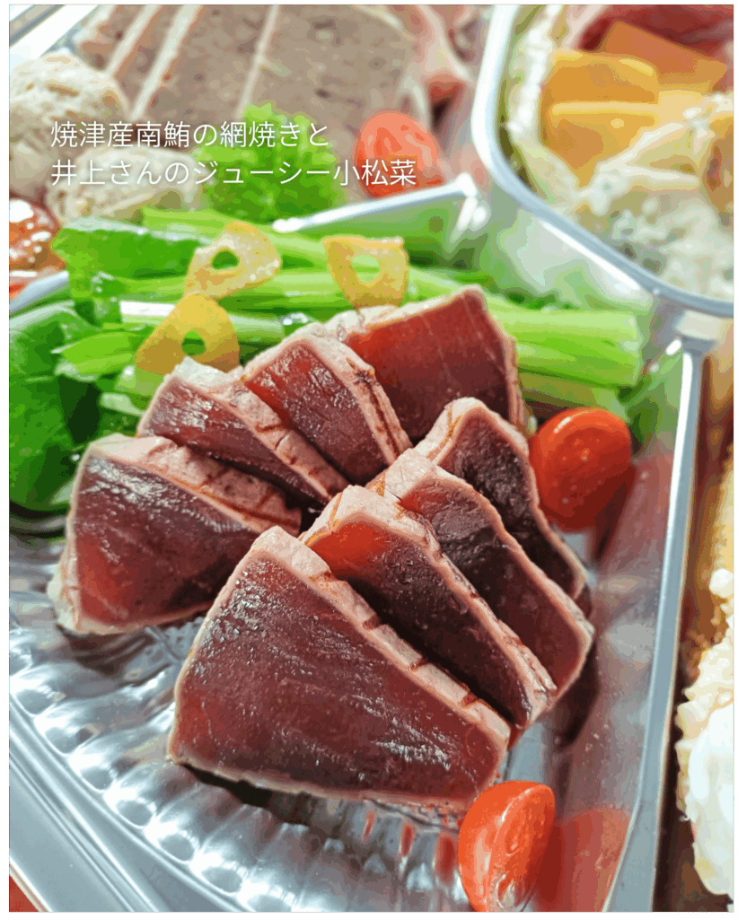 ・焼津産南鮪の網焼きと井上さんのジューシー小松菜