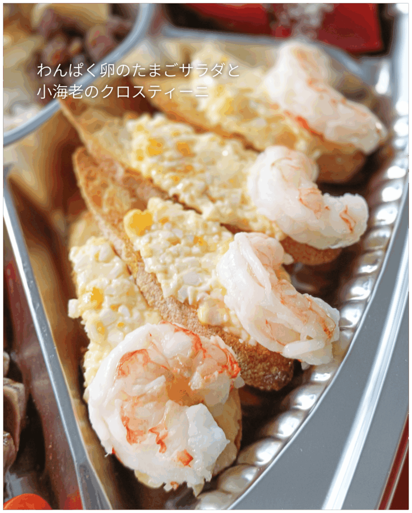 ・わんぱく卵のたまごサラダと小海老のクロスティーニ